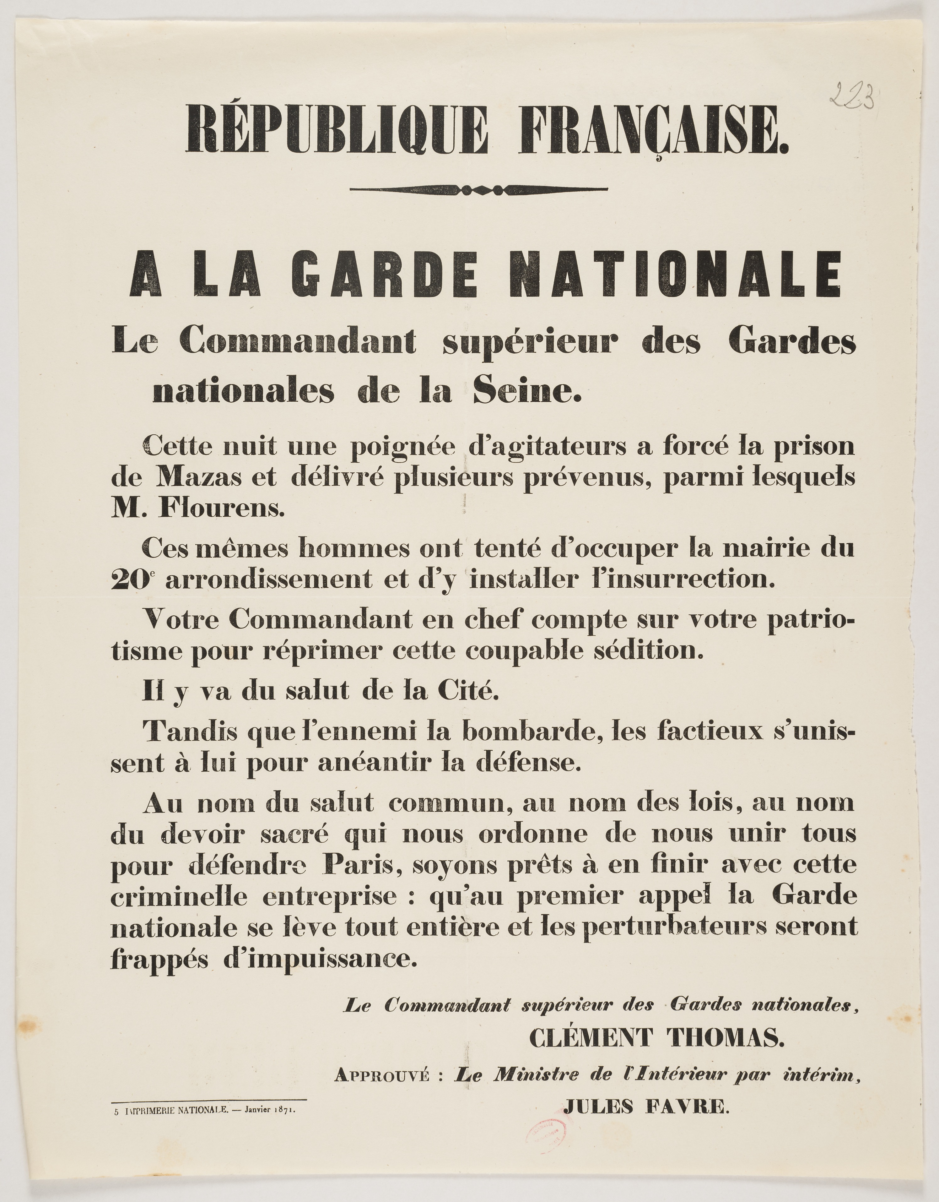 "A la Garde nationale. Le Commandant supérieur des gardes de la Seine. Janvier 1871." is preserved at Bibliothèque de l’Assemblée Nationale, an institution bearing the « Musée de France » label. This label ensures that the collections are managed rigorously in terms of conservation, inventory, and public accessibility.