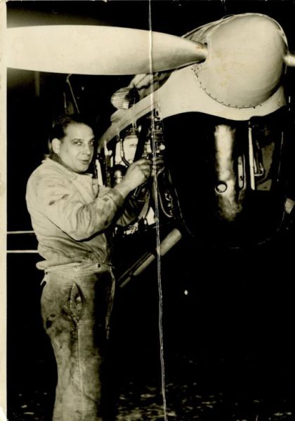 Cette photographie prise dans un hangar surprend André Prévot contrôlant le moteur du Simoun. La tôlerie est démontée pour accéder au moteur, le nez d'hélice est en place, les pales horizontales qui doivent correspondre à un certain alignement des pièces du moteur, confèrent un bel esthétisme à cette photographie.