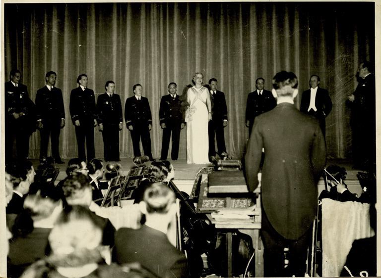 On aperçoit André Prévot à gauche de la scène, lors d'une cérémonie officielle. Un orchestre est installé en-contrebas de la scène.