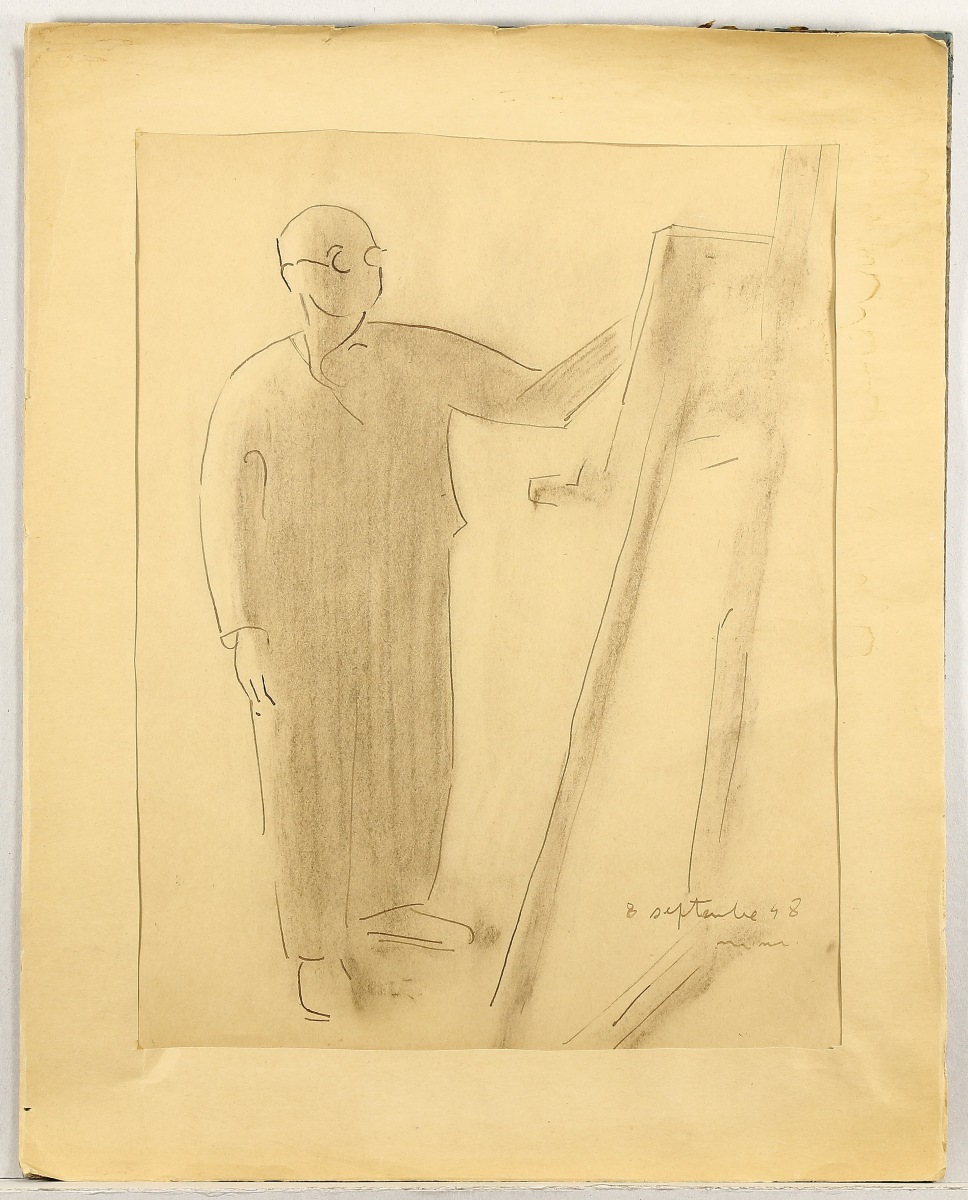 Crayon noir et encre sur papier vélin. ; Silhouette d'homme stylisé, travaillant devant son chevalet. ; Précisions sur la représentations décors : Autoportrait