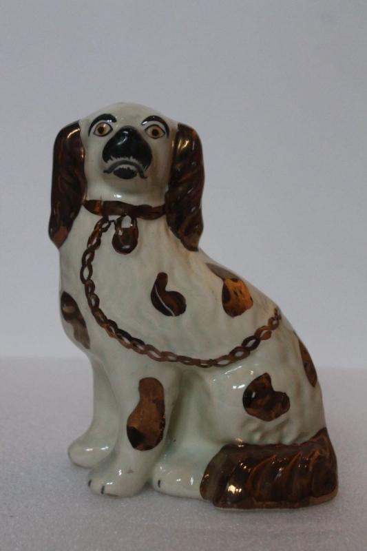 Décoration sous la forme d'un chien King Charles, en faïence, émaillé de blanc, doré et cuivré. Le chien porte un collier avec un cadenas et une laisse. Cette effigie du chien de compagnie du Roi Charles II Stuart, représenté assis, a été largement diffusée en couple.
