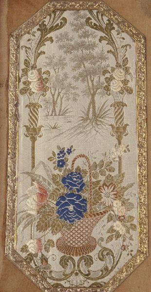 L'oeuvre paysage de anonyme fait partie des collections du musée d'art et industrie. La technique employée est : soie, métal, tissé. Format : hauteur en cm 21 ; largeur en cm 9.8 ; hauteur hors tout en cm 86 ; largeur hors tout en cm 69.5 ; épaisseur hors tout en cm 5. Sujet représenté : paysage,fond de paysage (panier, fleur, feuille, arbre, palmette). Cette pièce remonte à la 19e siècle.