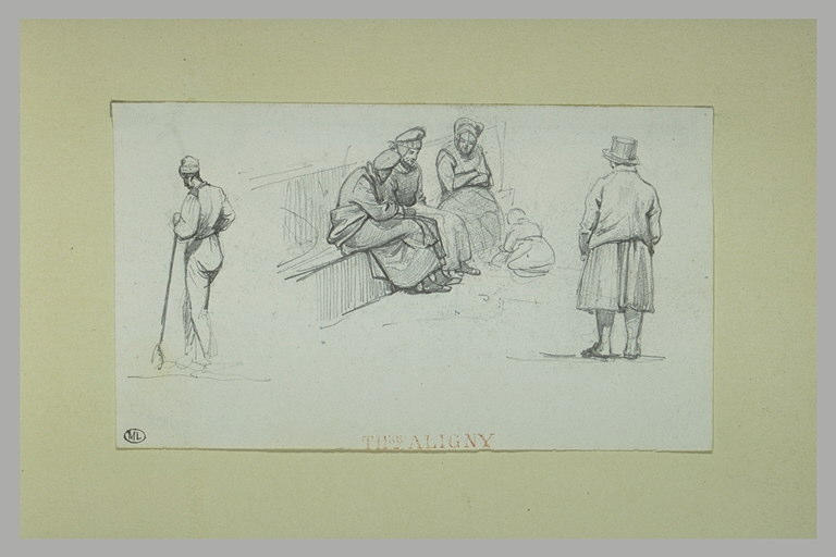 The artwork titled "Paysan debout ; homme debout et des paysannes assises", attributed to Caruelle d'Aligny Théodore (1798-1871), is preserved at musée du Louvre. This piece is listed in the Joconde database of the Ministry of Culture, which catalogues the works held in French museums.