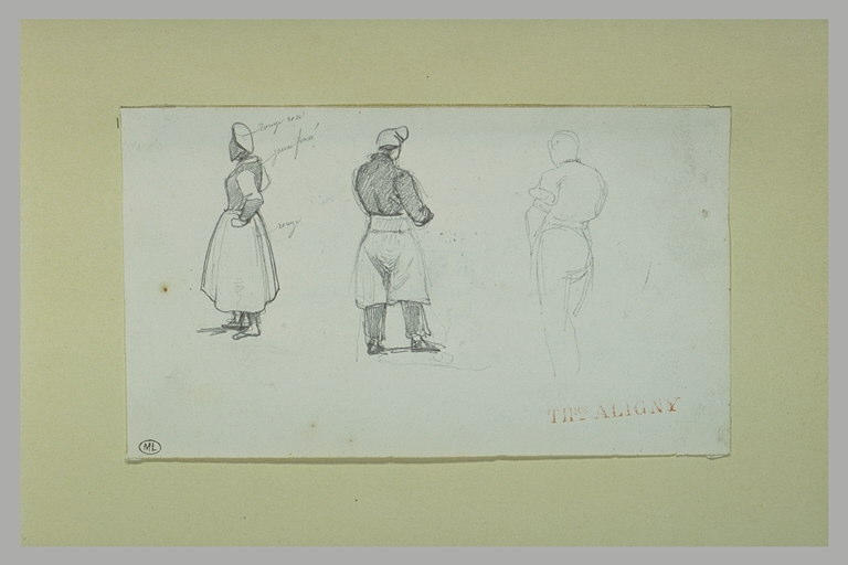 The artwork titled "Paysanne ; homme tourné à droite ; homme tourné à gauche", attributed to Caruelle d'Aligny Théodore (1798-1871), is preserved at musée du Louvre. This piece is listed in the Joconde database of the Ministry of Culture, which catalogues the works held in French museums.