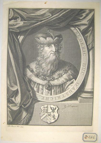 On doit Portrait de Frédéric, duc d'Autriche à PICART Bernard (graveur) ; l'oeuvre est au musée municipal. papier vergé, technique estampe est le procédé utilisé pour cette oeuvre. La pièce a pour dimensions H. 23 cm ; l. 15.8 cm. Elle figure : portrait,en médaillon (Frédéric II d'Autriche, Autriche duc d', homme, de face, barbe, couronne, collier, armoiries, Autriche). Sa période de création est la 1er quart 18e siècle. Complément d'information : PICART : Paris, 1673 ; Amsterdam, 1733.