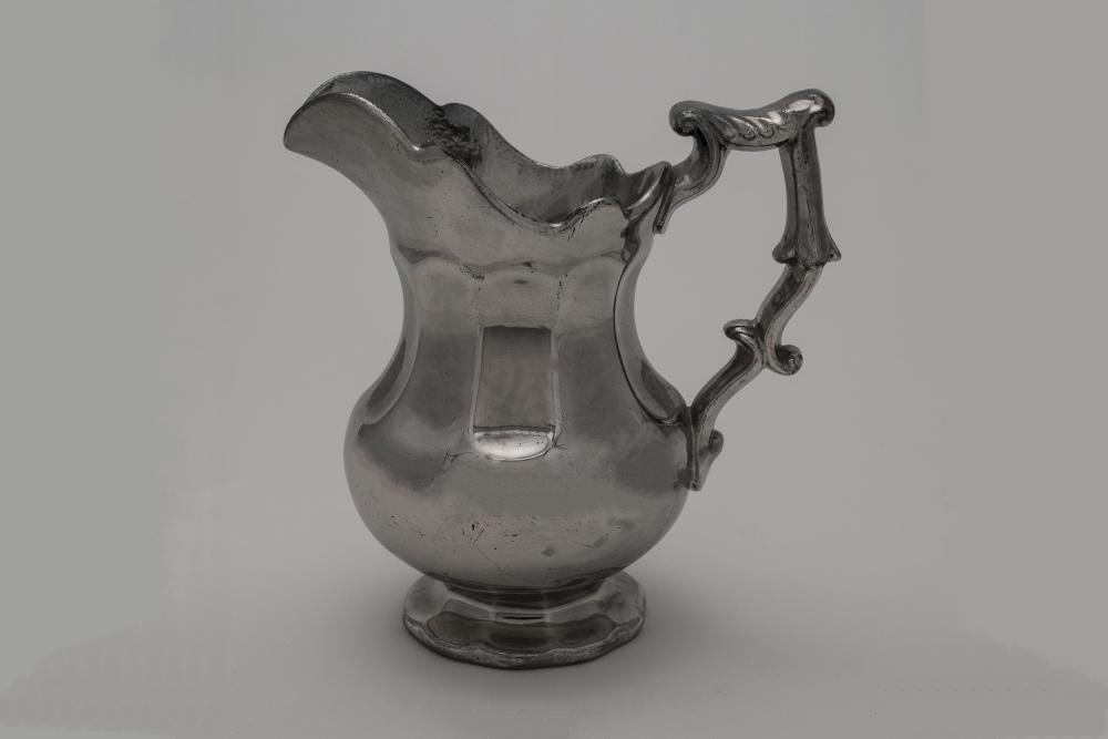 Pot à tranches à lustre argent disposant d'un anse 'appui pouce' travaillée. Ce pichet est formé de huit plis reliés à la panse par des facettes raccordées à un piédouche festonné.