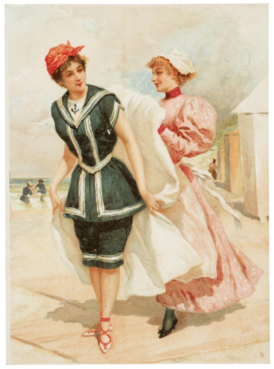 scène (femme, en pied, costume de bain, foulard, sortie, plage, mer, baignade, domestique, bonnet, tablier, remise, serviette, cabine de plage)