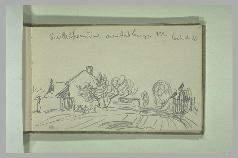 Album Sisley Alfred, folio 31, dessiné au recto ; Album oblong relié, recouvert de toile grise, composé de 61 feuillets. Le plat de devant porte une inscription au crayon :Croquis/ Novembre 1883/ Sisley, et le contreplat de derrière porte une étiquette imprimée du papetier Bodoul, de Moret-sur-Loing. ; Localisé, à la mine de plomb, en haut à droite :vieille chaumière aux Sablons . m. toile de 10