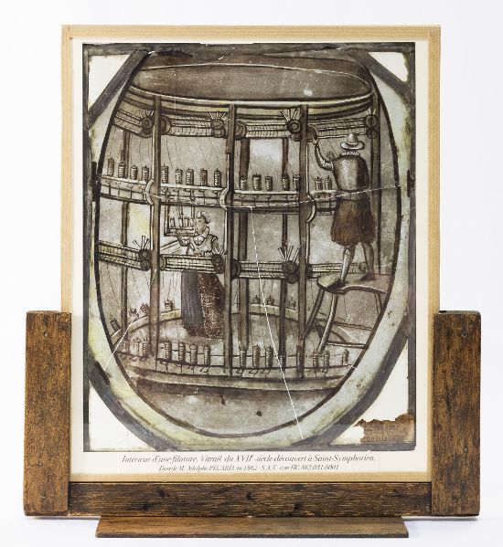 vitrail de forme ovale remonté dans un cadre en bois rectangulaire. Scène représentée : intérieur d'une filature avec dans un écheveau, à gauche, un homme sur un escabeau, et à l'arrière- plan, une femme.