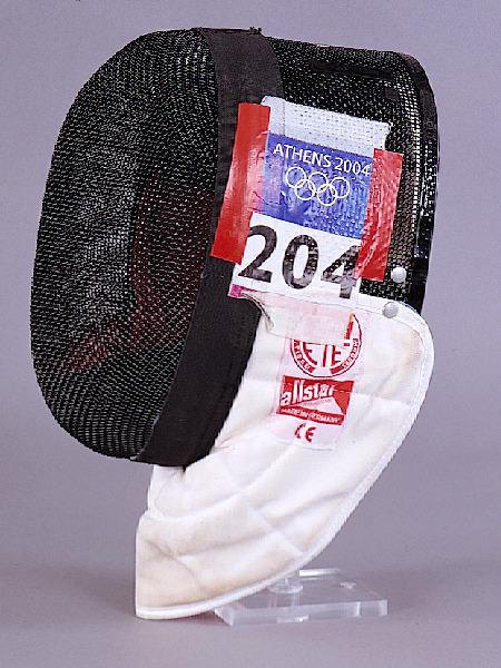 Masque d'escrime à dominante noire avec une partie métallique recouvrant la face et le haut du crâne et une partie en coton blanc 'la bavette' accrochée au niveau du cou afin de le protéger. Sur le côté du masque une étiquette porte des morceaux de scotch sur laquelle sont présentes des inscriptions. La languette métallique à l'arrière de la tête est renforcée par un morceau horizontal 'maison', fait de mousse et de ruban adhésif.