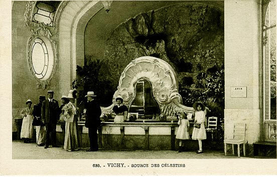 Le musée des civilisations de l'Europe et de la Méditerranée conserve 633 VICHY - SOURCE DES CELESTINS, oeuvre de B F S G. Cette pièce est en procédé photomécanique, monochrome (vert). Le thème de l'oeuvre est : Vichy,scène (cure, source, fontaine, niche architecturale, plante, serveuse, coiffe, comptoir, homme, femme, fillette, chapeau, chaise, thermes). Cette réalisation date de la 1er quart 20e siècle.
