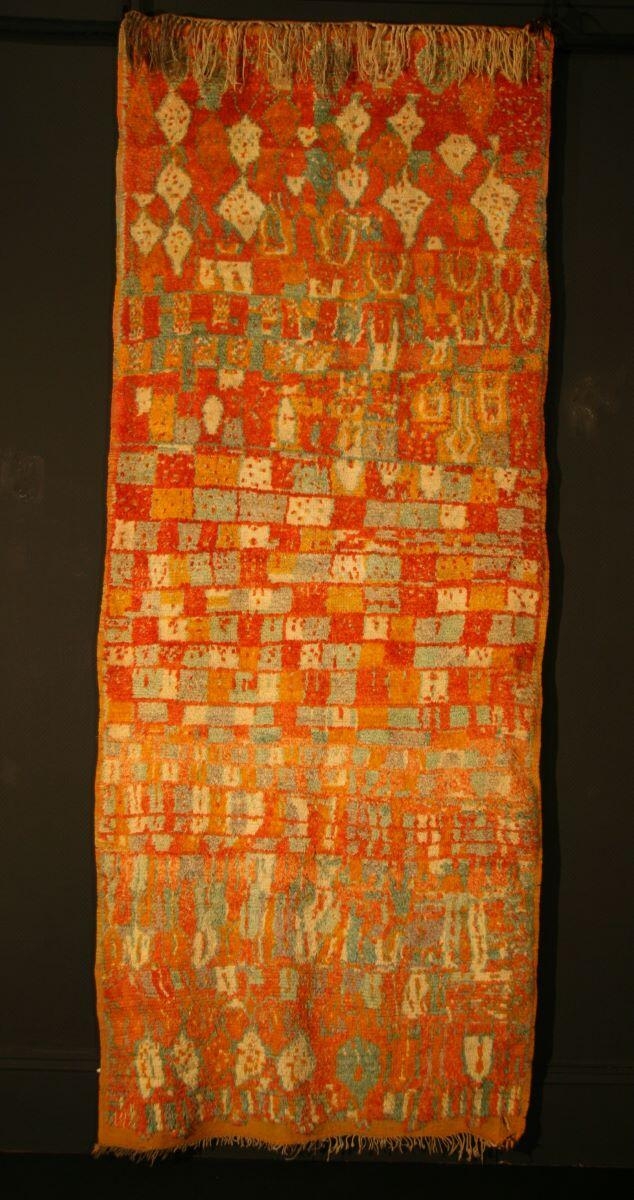 Tapis rectangulaire à motifs géométriques de couleurs jaune, orangé et bleu. Une interprétation possible de cette composition serait celle d’un village entouré par des champs eux-mêmes encerclés par les arbres. On peut aussi comparer le damier à des ruches. Tapis original dont les techniques de tissage sont proches de celle des Aït Ouaouzguite mais qui s’en distingue par les couleurs, la composition et les motifs du décor.. tapis noué main, noeud symétrique, laine