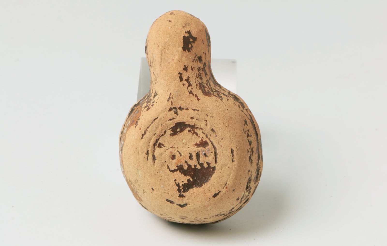 Loeschcke X a. Firmalampen moulée sans anse. Réservoir circulaire de profil biconvexe. Bandeau penché vers l'extérieur portant trois tenons rectangulaires non percés, sur l'axe horizontal. Disque en cuvette bordée par un bourrelet. Bec long au méplat en forme de pelle et ouvert sur le disque. Base circulaire plate limitée par trois sillons portant la marque "FORTIS" en relief. Trou d'évent. Médaillon oblitéré (volontairement ?). Pas de trace d'utilisation.