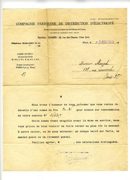 Feuillet à entête au nom de la Compagnie parisienne de distribution d'électricité, adressée à Monsieur Mensch l'informant qu'il est redevable d'un somme de 20,20 francs.