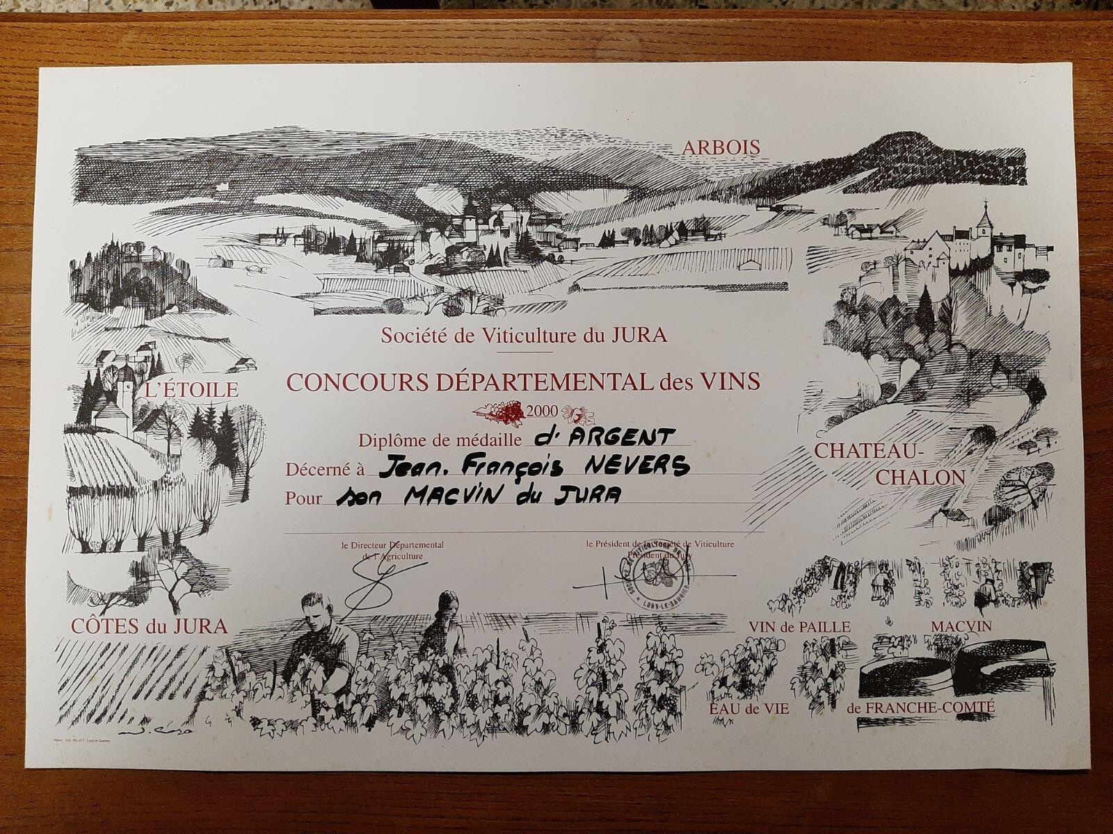 Tout autour du texte sont dessinées les 4 AOC géographiques : COTES du JURA en bas à gauche; L'ETOILE à gauche, ARBOIS en haut à droite, CHATEAU-CHALON à droite. En bas : scène de vendanges. En bas à droite 3 appellations : VIN de PAILLE, MACVIN, EAU de VIE de FRANCHE-COMTE.
