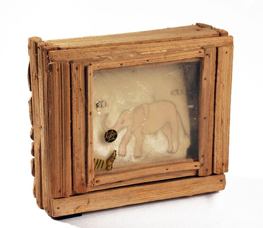 Télévision carrée en raphia. Sur l'écran en plastique transparent est dessiné une jambe de footballeur (tibia et pied chaussé d'une basket à crampons) et un balon de football. Sur papier derrière l'écran est dessiné un éléphant sans défenses, de profil. Ces jouets techniques sont de véritables modèles réduits des postes de radio, magnétophones et postes de télévision réels (Grunding, Philips...). Ils sont fabriqués par des garçons Baoulés de dix à treize ans habitants les villages de Boli, Afoumvassou et Diaman-Sakassou en Côte-d’Ivoire. Chaque enfant ajoute sa touche personnelle dans la décoration ou la reproduction des fonctionnalités des appareils.