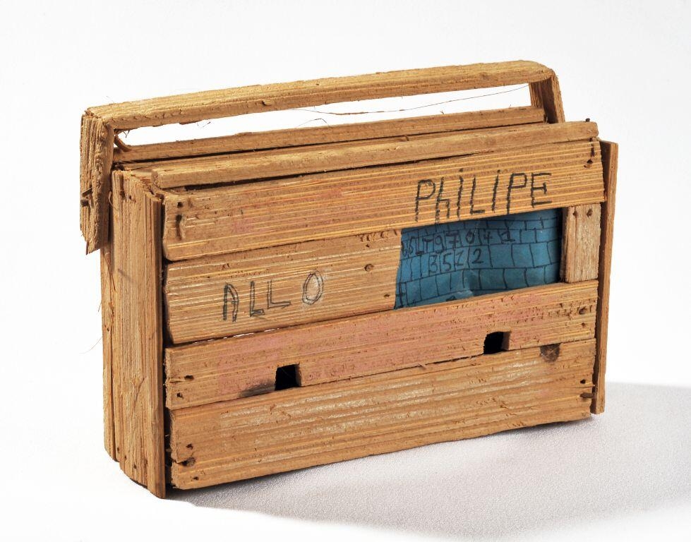 Poste de radio de forme rectangulaire avec une poignée sur le dessus. Une fenêtre sur le devant laisse apparaitre un papier bleu avec les fréquences radio manuscrites. Ces jouets techniques sont de véritables modèles réduits des postes de radio, magnétophones et postes de télévision réels (Grunding, Philips...). Ils sont fabriqués par des garçons Baoulés de dix à treize ans habitants les villages de Boli, Afoumvassou et Diaman-Sakassou en Côte-d’Ivoire. Chaque enfant ajoute sa touche personnelle dans la décoration ou la reproduction des fonctionnalités des appareils.