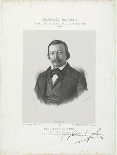 LAFOSSE Adolphe (lithographe);LEMERCIER et Cie (imprimeur) est l'auteur de Ferdinand Flocon, oeuvre conservée au musée national du château de Compiègne. La technique employée est : lithographie. Mesures : Hauteur en cm (feuille) 30.4 ; Largeur en cm (feuille) 22.9. L'oeuvre dépeint : portrait (Flocon Ferdinand, homme politique, ministre, homme, en buste). Elle a été créée durant la 19e siècle. À propos de cette pièce : LAFOSSE : ?, 1810 ; ?, 1879 ;#Lemercier Joseph : Paris, 1803 ; Paris, 1887. Imprimerie fondée en 1837, rue de Seine.