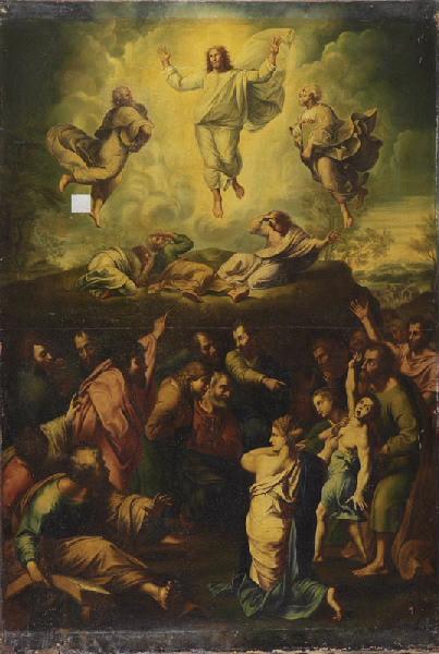 scène biblique (Transfiguration, Moïse, Elie, saint Jacques le Majeur, saint Pierre, saint Jean l'Evangéliste, homme, délivrance de possédé)