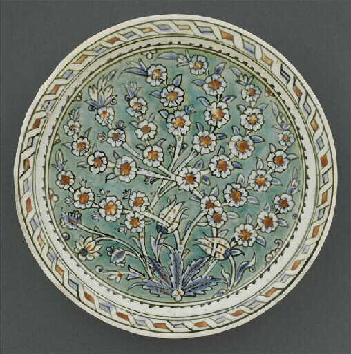 Esta obra pertenece al dominio: céramique, Asie occidentale. Fue realizada con los siguientes materiales y técnicas: faïence siliceuse, tournage. Su período de creación se identifica como: 4to cuarto XVI siglo.