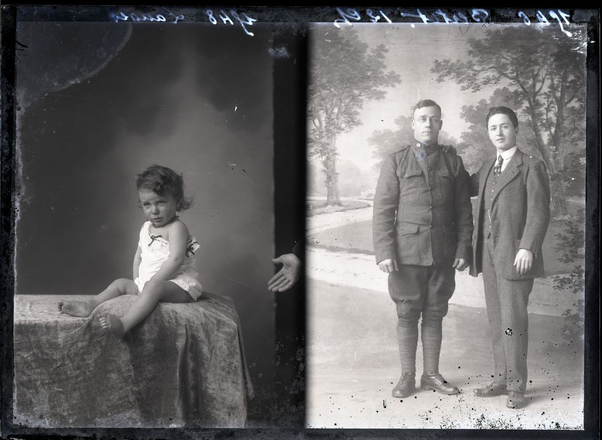La plaque de verre comprend deux prises de vue non identiques en atelier représentant deux hommes dont un militaire, se tenant debout et se faisant tirer le portrait. L'autre cliché représente une petite fille posant sur un support couvert avec du velour.