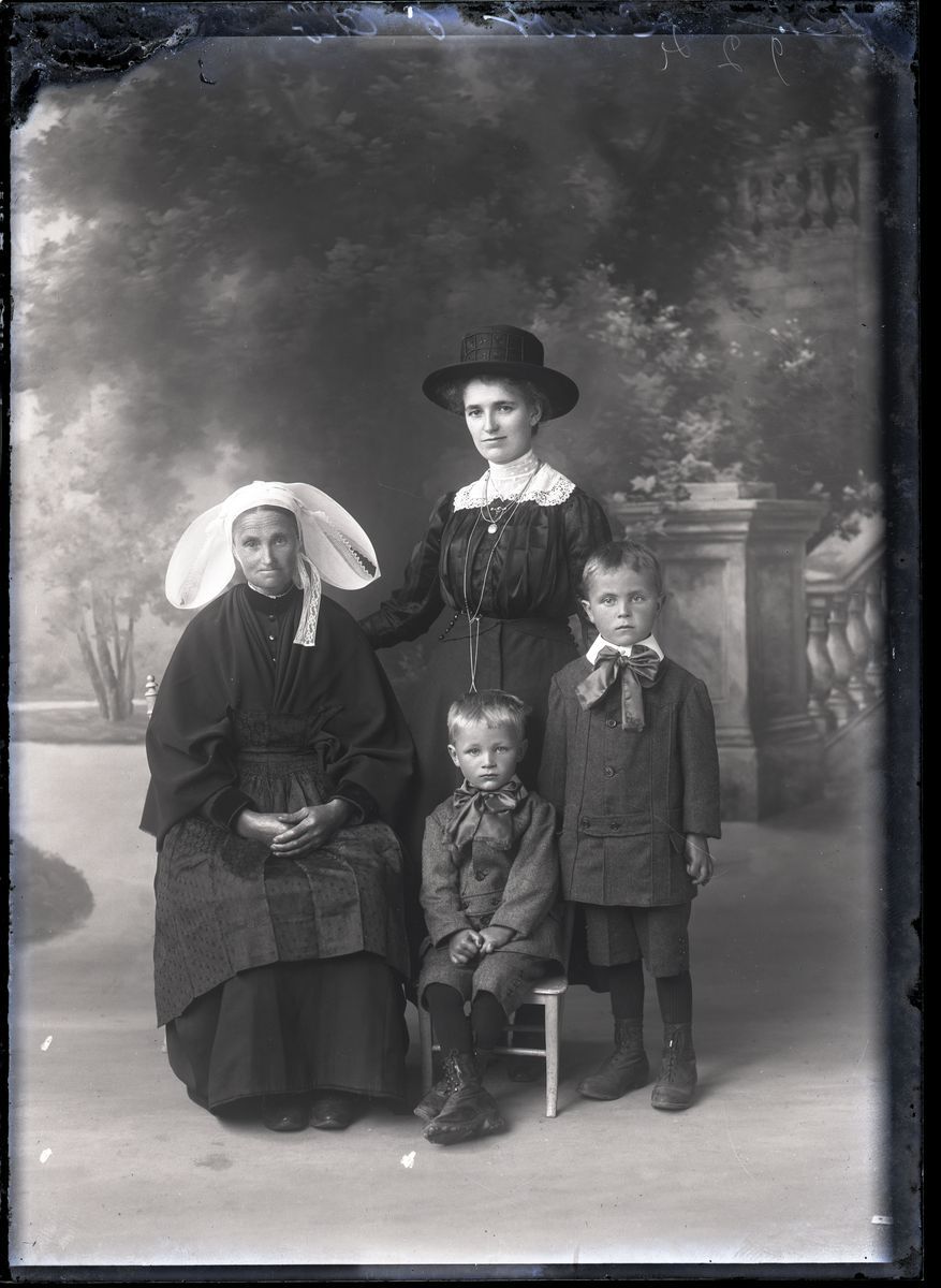 La plaque de verre comprend une prise de vue représentant un groupe de quatre personnes posant dans l'atelier du photographe. Une femme est assise, elle porte le costume traditionnel breton et la coiffe. Une autre femme se tient debout portant une robe et un chapeau. Deux jeunes garçons se tiennent devant elle.