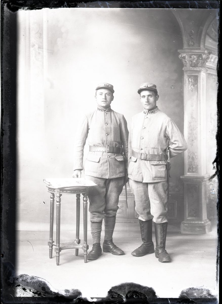 La plaque de verre comprend une prise de vue représentant deux militaires en uniforme posant dans l'atelier du photographe. Ils se tiennent debout, l'un s'appuyant sur un guéridon.