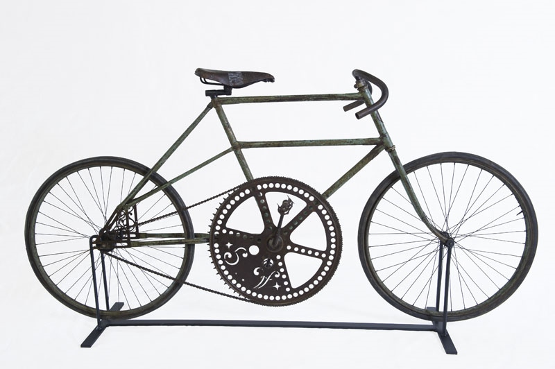 La réalisation fait appel à métal (métallurgie). Elle mesure Poids en kg. 17 ; H. cm 100 ; L. cm 205 ; D. roue avant en cm 69 ; D. roue arrière en cm 69. L'oeuvre date de la 4e quart 19e siècle.