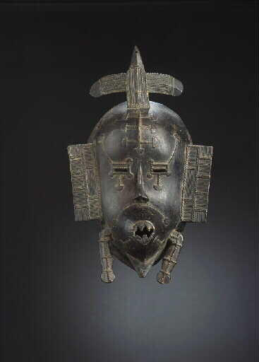 Masque représentant un visage humain stylisé et orné de scarifications. Yeux sculptés mais clos. Partie inférieure du visage proéminente avec bouche entrouverte et dents marquées. Petite barbe pointue, deux petites 'jambes' de chaque côté des joues, front orné d'un motif et surmonté d'un cimier, deux 'oreilles' de forme rectangulaire ornent chaque côté du visage