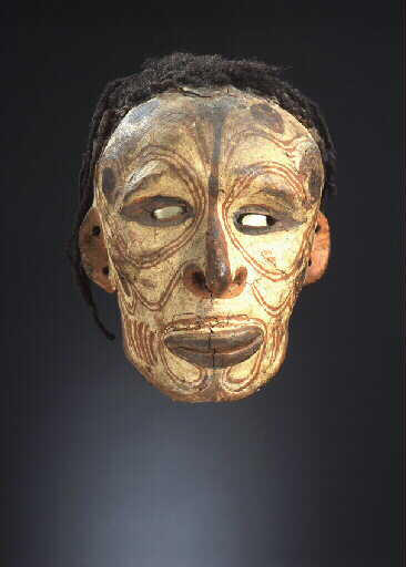 Crâne représentant un ancêtre. La face est recouverte de peinture blanche sur laquelle sont dessinées des sinuosités parallèles ocre rouge épousant les courbes du visage. Les cheveux du mort sont implantés dans l'argile et pendent en arrière. Les yeux ouverts sont figurés par une plaque de nacre. La bouche est fermée avec des lèvres marquées par un trait rouge.