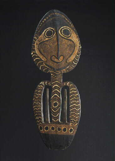 Planche sculptée porte-crâne, représentant la partie supérieure d'un corps humain, avec deux bras plaqués le long du tronc. Entre chaque bras et le tronc une tige verticale permet d'attacher les crânes. Les traits du visage sont stylisés, la coiffure est marquée par une série de chevrons, les bras et la partie supérieure du corps sont ornés de motifs géométriques (chevrons, ronds) polychromes.