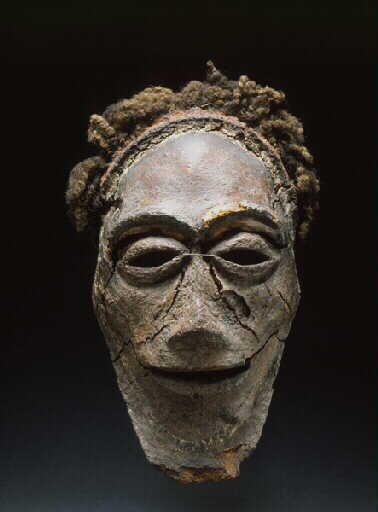 Masque de danse confectionné avec la partie antérieure du crâne (os de la face et partie frontale de la calotte cranienne) puis recouvert d'un surmodelage en pâte végétale (contenant de la noix de paninarium) peint : reste des traces de motifs blancs sur fond gris. Représentation des orbites vides, bouche entrouverte, réimolantation des cheveux du défunt, menton prolongé par un reste de barbe
