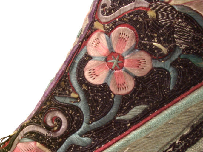 Quest'opera appartiene al settore: costume - accessoires du costume, Asie orientale, ethnologie. È stata realizzata con i seguenti materiali e tecniche: tissu (brodé), fil métallique. Il suo periodo di creazione è identificato come: XVIII secolo.