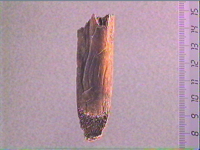 La technique employée est : os, gravé. Dimensions : L. 7.3 ; La. 2.2 ; E. 0.7. Le sujet représenté est : représentation animalière (?, patte).