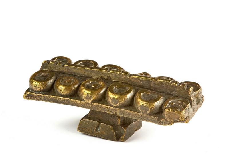 Akan (population);Baoulé (population) a utilisé ici laiton (fonte à la cire perdue). La pièce a pour dimensions Hauteur en cm : 1,5 ; Largeur en cm : 4 ; Profondeur en cm : 1,6. L'oeuvre représente : représentation d'objet (jeu). Cette réalisation date de la 4e quart 20e siècle.