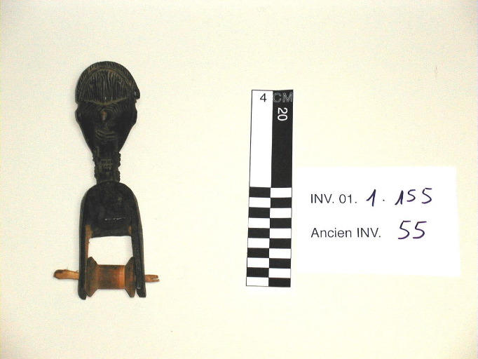 Poulie de métier à tisser en bois sculpté. Elle est composée d'un étrier et d'une bobine. La bobine en bois est sans doute une bobine de fil européenne. La poulie assure le balancement des lisses que traversent les fils de la chaînes RERP figure (tête : homme; scarifiacation)