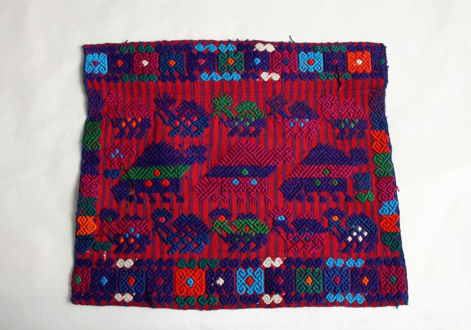 La réalisation fait appel à coton (tissage, toile, broché), matériau d'origine synthétique (teinture). Elle mesure L. 33 cm ; l. 29 cm. Sujet représenté : ornementation (ornement à forme géométrique, rayure, losange, volute),représentation animalière (mammifère). Elle est datée de la 4e quart 20e siècle. On sait de cette oeuvre que : Les Cakchiquels sont un groupe ethnique issu de la civilisation maya.