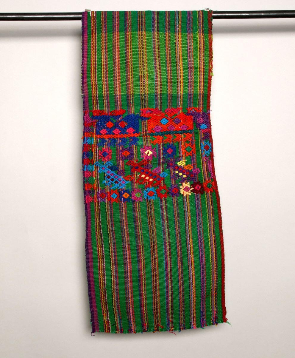 Elle est réalisée avec la technique suivante : coton (tissage, toile, broché, cousu), matériau d'origine synthétique (teinture). Ses dimensions sont L. 74 cm ; l. 31 cm. Le thème de l'oeuvre est : ornementation (ornement à forme géométrique, rayure, losange, croix),représentation animalière (tigre, quadrupède). Cette pièce remonte à la 4e quart 20e siècle. Précisions sur cette oeuvre : Les Cakchiquels sont un groupe ethnique issu de la civilisation maya.
