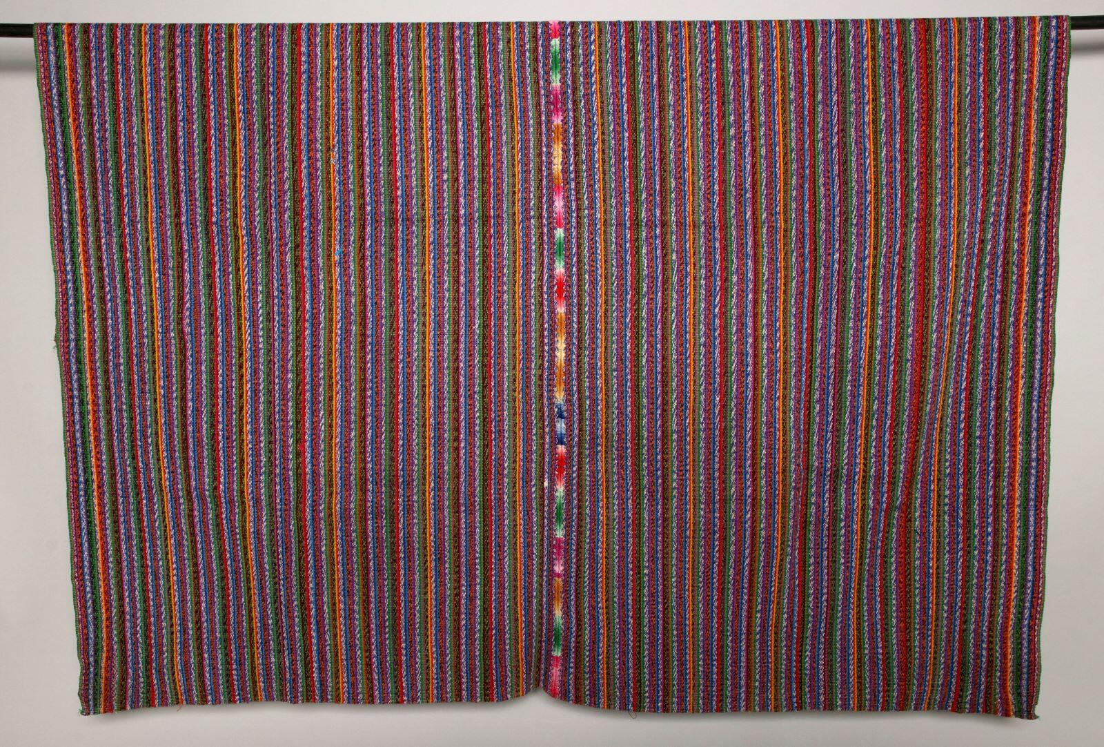 Il s'agit d'une oeuvre en coton (tissage, toile, cousu), matériau d'origine synthétique (teinture). La pièce a pour dimensions L. 135 cm ; l. 135 cm. Le sujet de cette oeuvre : ornementation (ornement à forme géométrique, rayure). L'oeuvre date de la 4e quart 20e siècle. Note sur cette oeuvre : Les Cakchiquels sont un groupe ethnique issu de la civilisation maya.