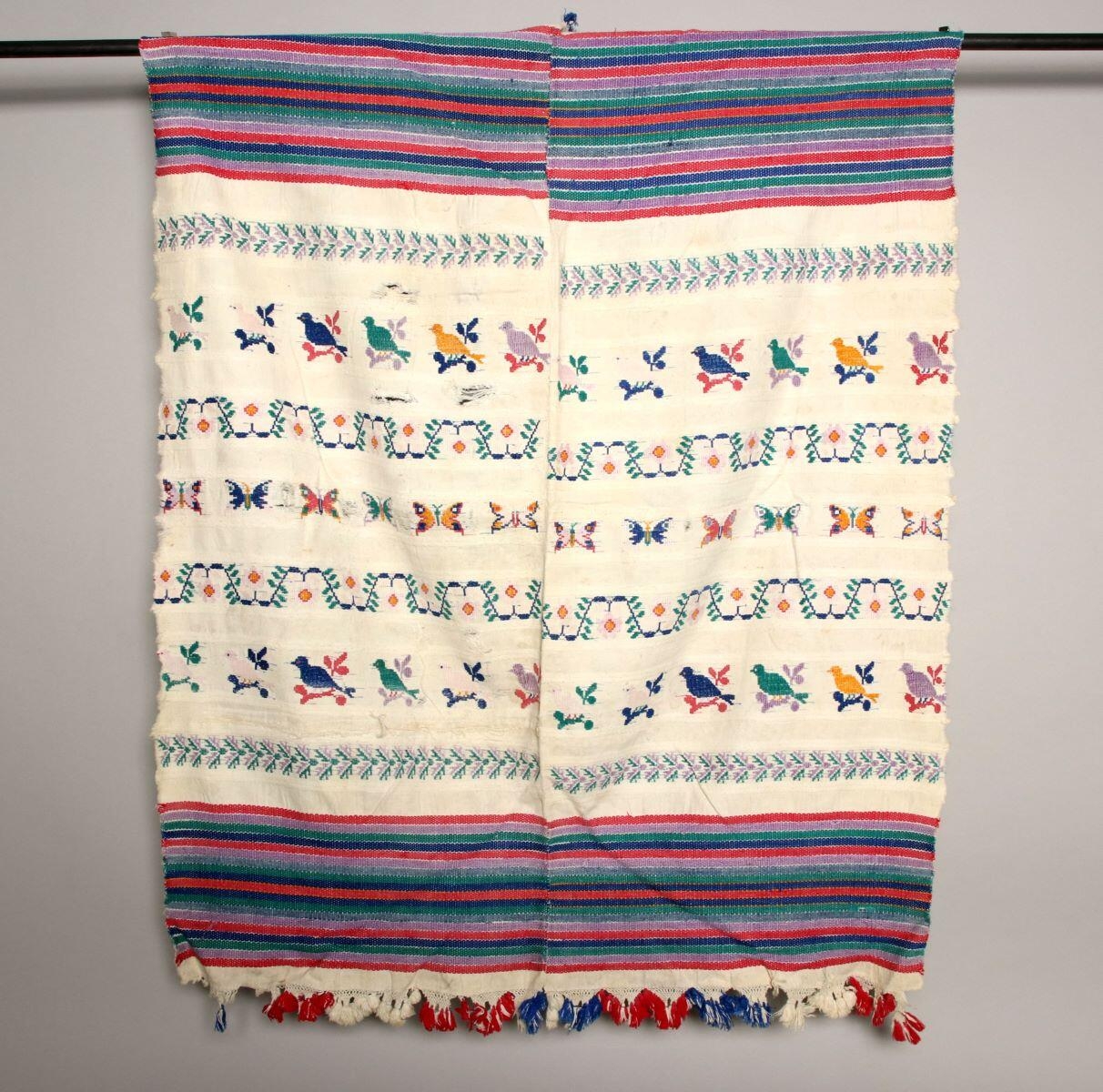 La technique employée est : coton (tissage, toile, broché, frange, pompon, cousu), matériau d'origine synthétique (teinture). Mesures : L. 113 cm ; l. 90 cm. Cette pièce a pour sujet : ornementation (ornement à forme géométrique, ligne),représentation animalière (oiseau, papillon),représentation vétégatle (fleur, feuille). Sa période de création est la 4e quart 20e siècle. À propos de cette pièce : Les Cakchiquels sont un groupe ethnique issu de la civilisation maya.