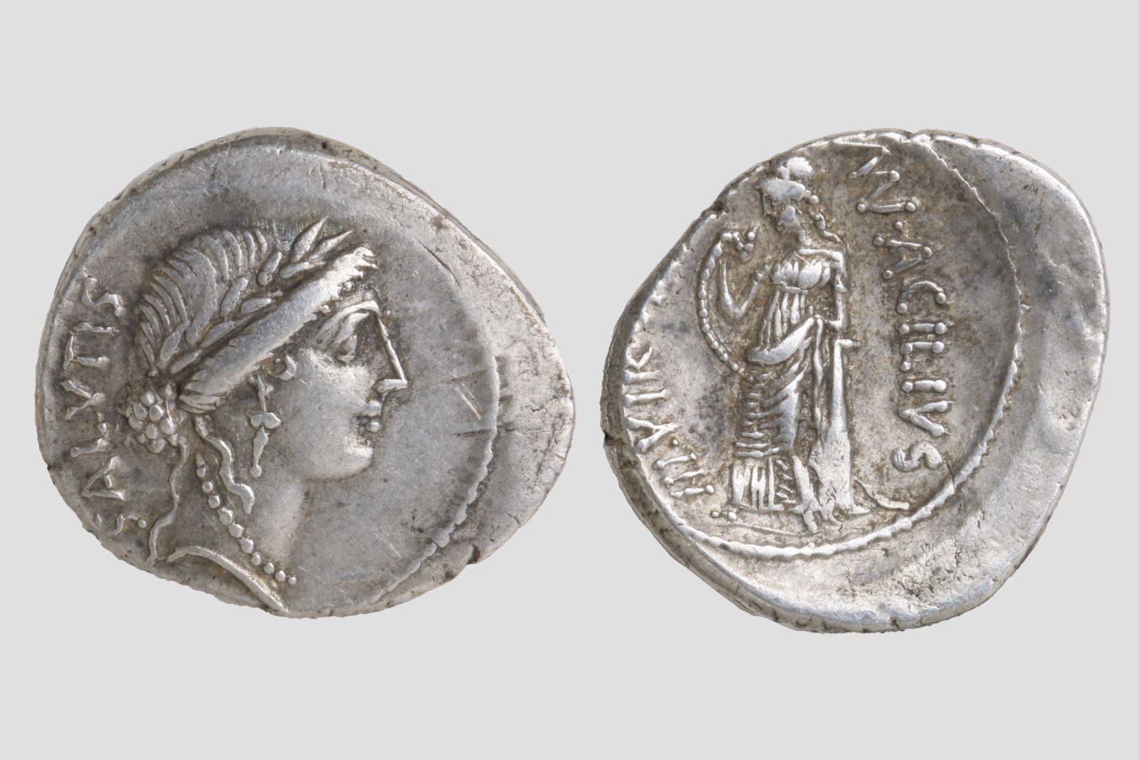 RRC 442/1 – B.8 (Acilia). Denier républicain en argent de Manius Acilius Glabrio.
