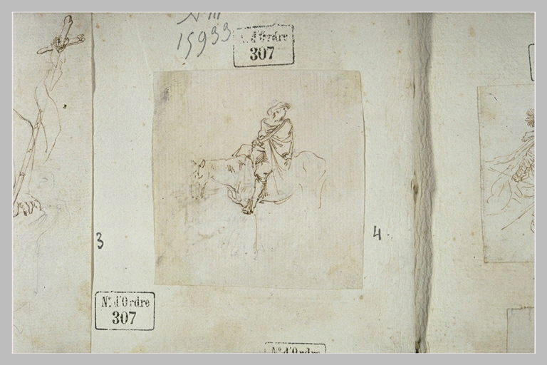 Album Della Bella Stefano, folio 4, rapporté au verso ; Album cartonné recouvert de papier brun marbré. Il porte sur le plat une étiquette avec la mention suivante :Stefano della Bella, et sur le dos, une autre, annoté :vol. I. Ce volume est paginé de I à 126, chacun des soixante-trois feuillets qui le composent portant un numéro au recto et au verso. Les dessins sont collés, soit en plein, soit par un onglet sur le feuillet de l'album. H : 0,460 ; L : 0,365. ; Pierre noire, plume et encre brune