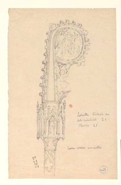 Crosse ivoire émaillée, oeuvre de dessin, est due à LENEPVEU Jules Eugène (dessinateur) et conservée au musée des beaux-arts et galerie David-d'Angers. Cette oeuvre est réalisée en mine de plomb, papier (blanc). Les dimensions de l'oeuvre sont : Hauteur en m 0.312 ; Largeur en m 0.201. L'oeuvre dépeint : représentation d'objet (objet du culte, crosse),scène. Elle a été créée durant la 19e siècle. À propos de cette pièce : LENEPVEU : Angers, 1819 ; Paris, 1898 ; nationalité : Française.