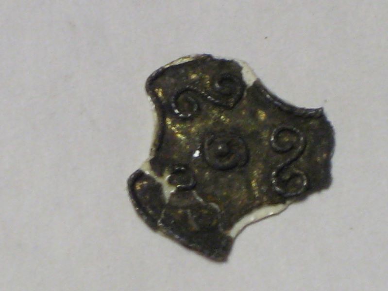 Elément de fibule discoïde. Trois "S" rapportés entourent un cercle pointé