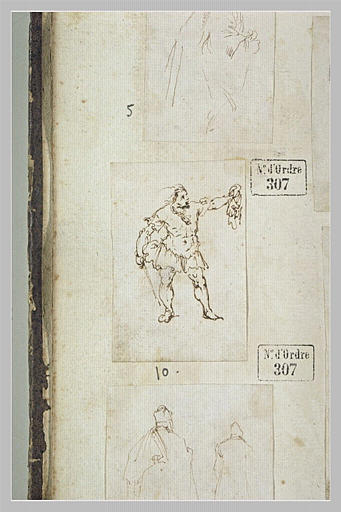 Album Della Bella Stefano, folio 4, rapporté au verso ; Album cartonné recouvert de papier brun marbré. Il porte sur le plat une étiquette avec la mention suivante :Stefano della Bella, et sur le dos, une autre, annoté :vol. I. Ce volume est paginé de I à 126, chacun des soixante-trois feuillets qui le composent portant un numéro au recto et au verso. Les dessins sont collés, soit en plein, soit par un onglet sur le feuillet de l'album. H : 0,460 ; L : 0,365. ; Plume et encre brune