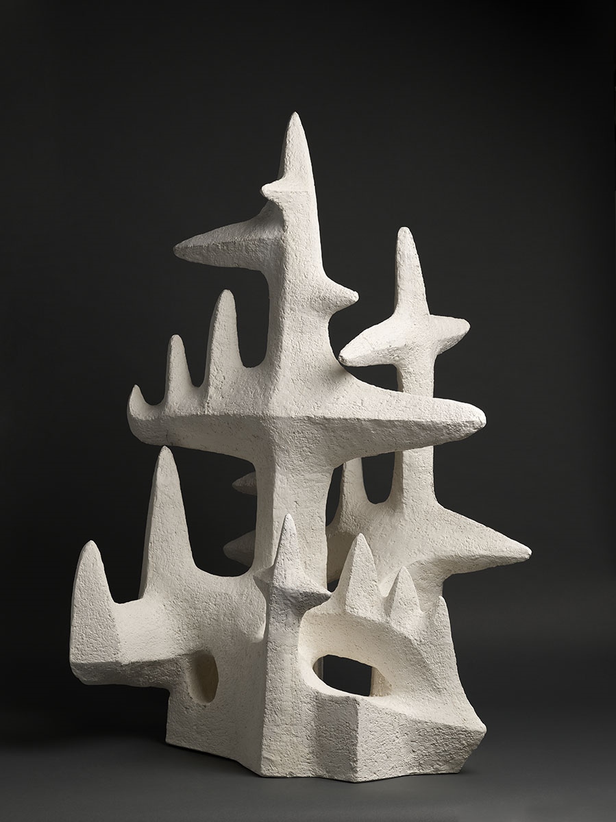Plâtre ; L’élan des troncs stylisés et le réseau de branches architecturées évoquent aussi bien une forêt fantastique que les calvaires de granit qui bordent les routes bretonnes. Cette œuvre puissante est représentative de la période « sauvage » de Boisecq. Les formes naturelles, fortement architecturées, fusionnent dans un syncrétisme hybride qui puise ses influences dans les imaginaires celte et algérien, chers à l’artiste.