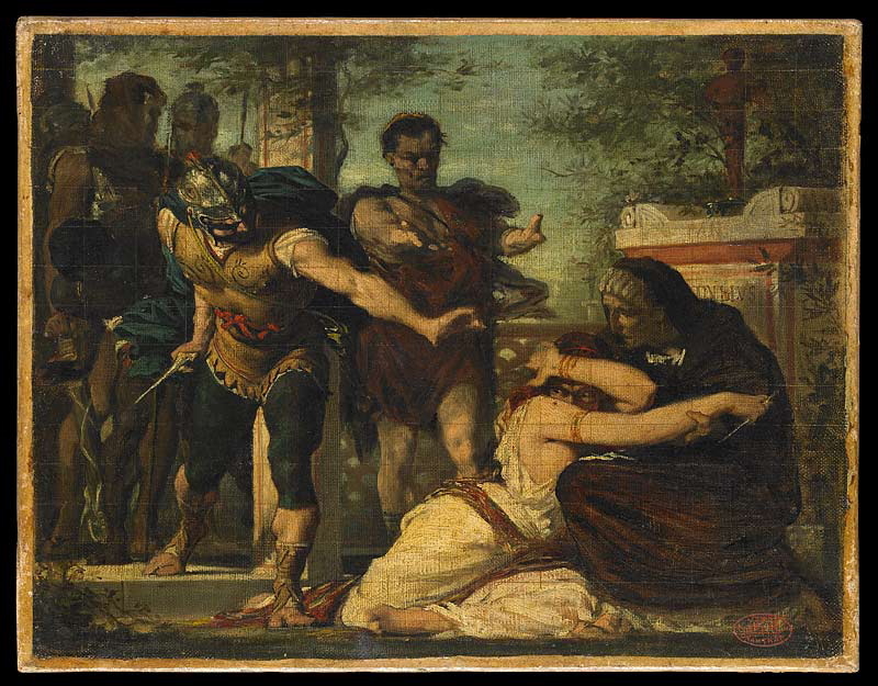 scène historique (antiquité romaine, impératrice romaine : Messaline, mise à mort, soldat, casque)