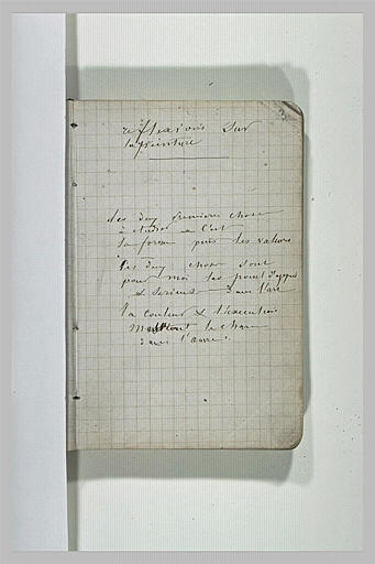 Notes manuscrite de Corot : Réflexions sur la peinture, oeuvre de dessin, est due à Corot Camille (1796-1875) et conservée au musée du Louvre. Elle est réalisée avec la technique suivante : encre brune, plume. L'oeuvre présente les dimensions suivantes : H. en m 0,140 ; L. en m 0,092. La création de cette oeuvre remonte à la 19e siècle. À propos de cette pièce : Corot, Jean Baptiste Camille, dit Camille Corot ; Paris, 1796 ; Paris, 1875.