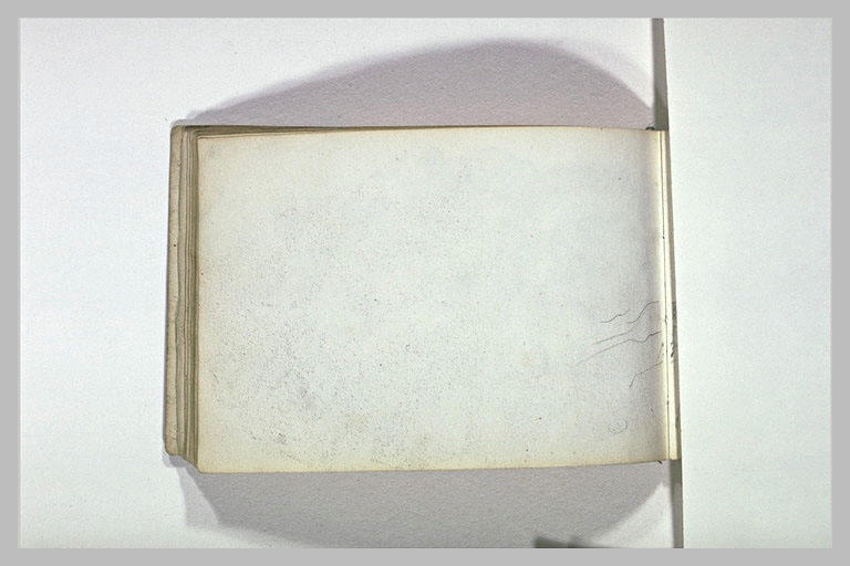 Album Andrieu Pierre -4-, folio 14, dessiné au verso ; Carnet cartonné, anciennement classé à Delacroix, comportant le cachet E. D. sur plusieurs folios. Croquis d'animaux, de paysages de montagne et de personnages. H. 0,091 ; L. 0,137