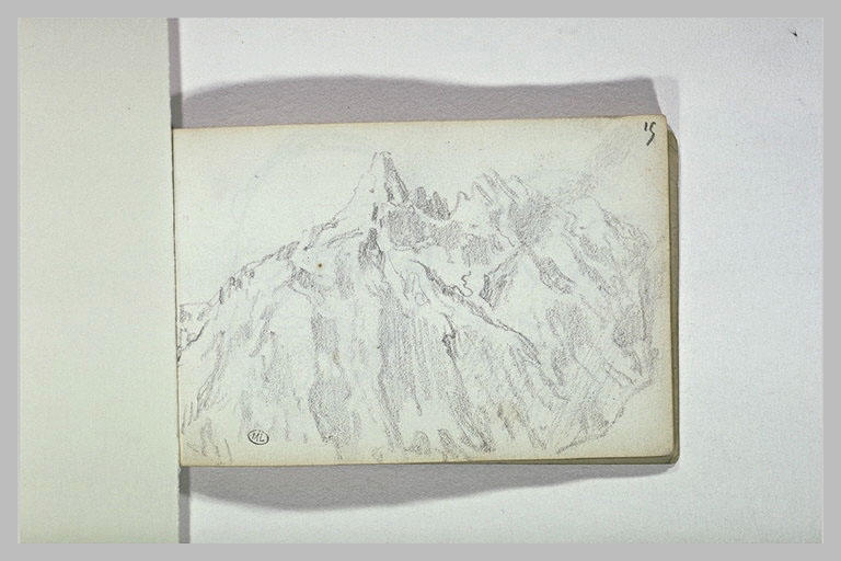 Album Andrieu Pierre -4-, folio 15, dessiné au recto ; Carnet cartonné, anciennement classé à Delacroix, comportant le cachet E. D. sur plusieurs folios. Croquis d'animaux, de paysages de montagne et de personnages. H. 0,091 ; L. 0,137